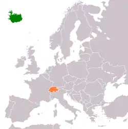 - איסלנד אינה מיוצגת בשווייץ בדרג השגרירות. איסלנד מיוצגת בשווייץ בדרג הקונסולרי באמצעות שלוש קונסוליות רשמיות שהיא מחזיקה בערים: ברן,[1] ז'נבה,[2] וציריך.[3] איסלנד האמינה את שגרירותה שבבריסל, בירת בלגיה, על שווייץ.