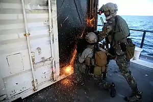 - ↑ משרד ההגנה האמריקני הגדיר פעולה ישירה כ"פשיטות קצרות והתקפות בקנה מידה קטן המתבצעות בסביבות עוינות, מוכחשות או רגישות פוליטית, ומפעילות יכולות צבאיות מיוחדות כדי לתפוס, להשמיד, ללכוד, לנצל או לפגוע ביעדים שהוגדרו. פעולה ישירה שונה מפעולות התקפיות קונבנציונליות ברמת הסיכון הפיזי והמדיני, בשיטות הפעולה, וברמת יכולת ההפללה והדיוק הנדרשים כדי להשיג יעדים ספציפיים."