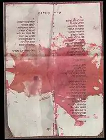 ![]() תמונה זו מוצגת במכלול בשימוש הוגן. נשמח להחליפה בתמונה חופשית. הדף המוכתם בדם עם מילות שיר לשלום שיצחק רבין קרא דקות טרם הירצחו | ||